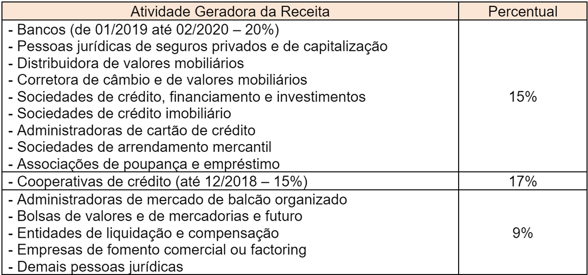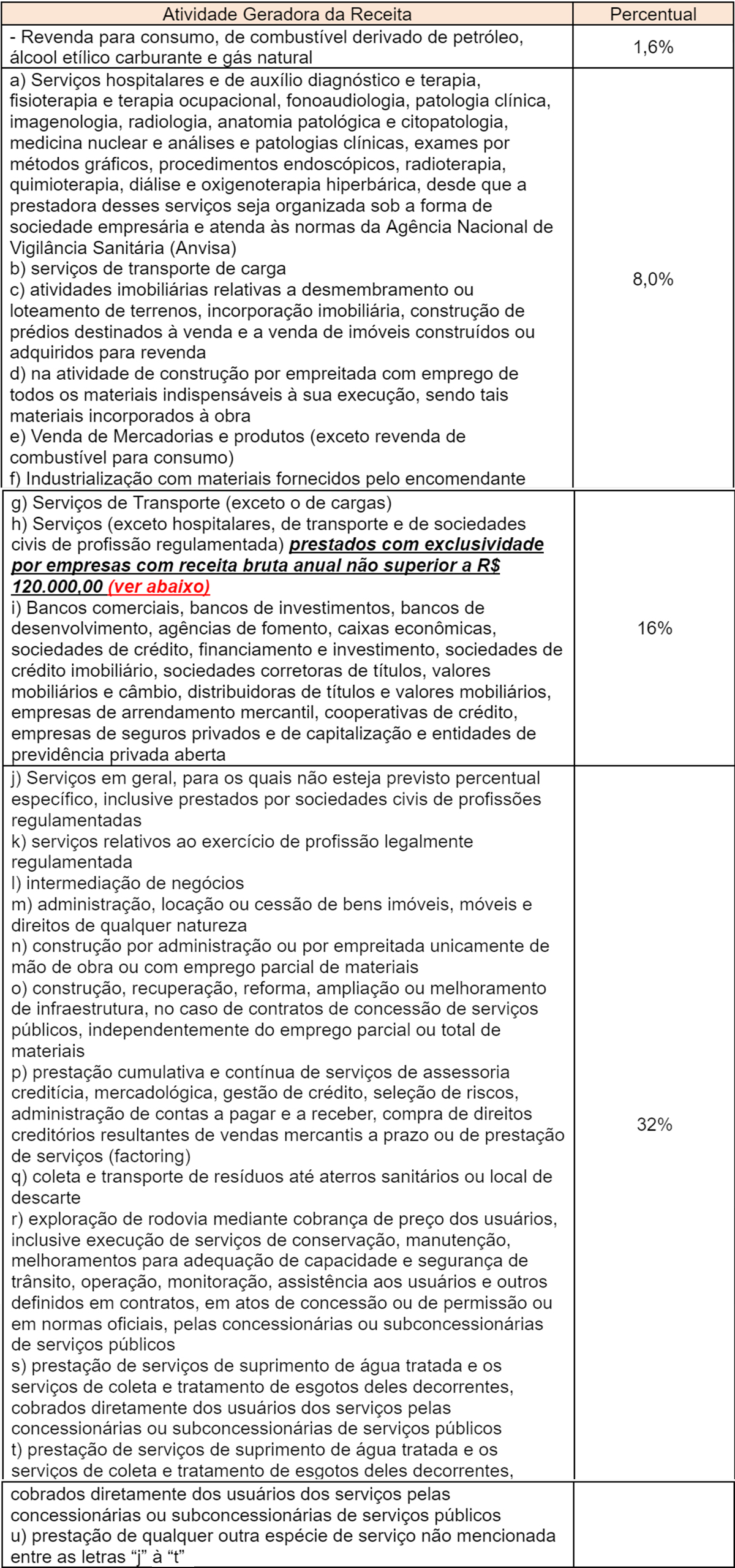 PERCENTUAIS DE PRESUNÇÃO APLICÁVEIS SOBRE A RECEITA BRUTA DA ATIVIDADE: