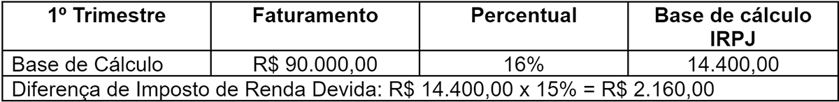 No caso da pessoa jurídica que houver utilizado o percentual de 16% para o pagamento mensal do IRPJ, cuja receita bruita acumulada até o determinado mês do ano calendário exceder o limite de R$ 120.000,00 (cento e vinte mil reais)ficará sujeita ao pagamento da diferença do imposto postergado, apurada em relação a cada mês transcorrido.